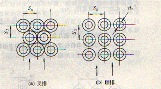 下圖是指對于不同翅片結構的翅片管,如矩形翅片或整體的板狀翅片(又稱板翅),同樣有叉排和順排之分。
