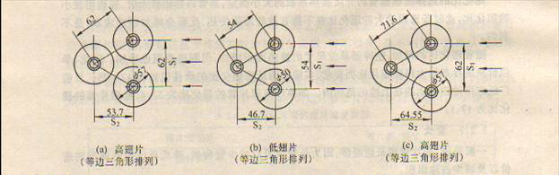 對于叉排管束,經常采用等邊三角形排列,又時也采用等腰三角形排列,下圖所示的是在翅片管散熱器上所應用的幾種等邊三角形排列的尺寸規格。